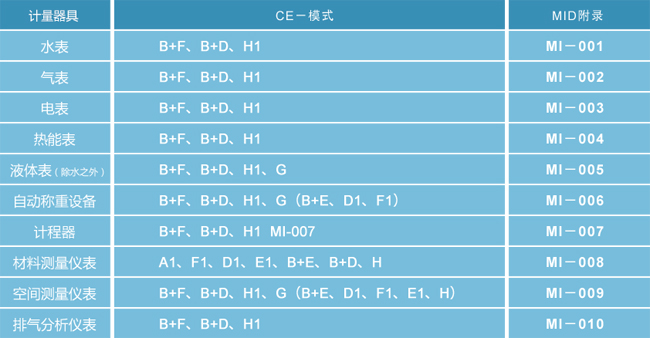 計量器具被用在公眾利益、健康、安全、秩序、保護環境、保護消費者、旅行、稅收、關稅等方面,所有的這些都在原則上要求符合MID的要求。在實際操作過程中,MID主要規范如下計量器具: